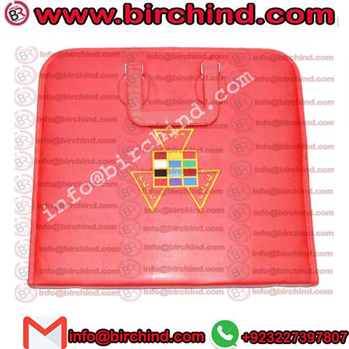 D.D.G.M. Masonic Apron Case Masonic Apron Case 2 side zipper opening Red leather Quality Metal Lock Inside pocket and strap to hold apron, gloves and accessories Solid Hand Strap Size 16" X 18" Size 17" X 19"