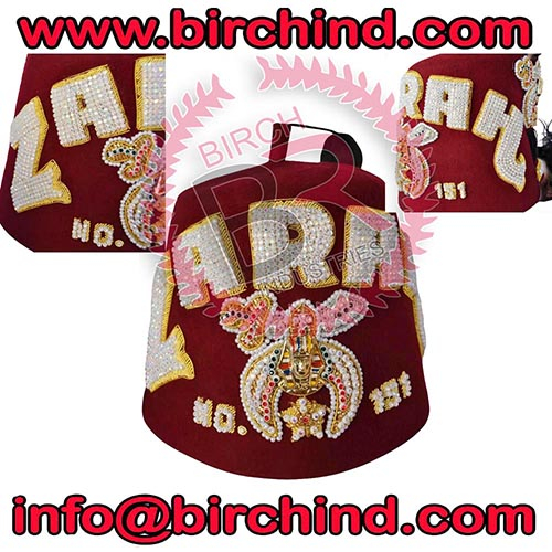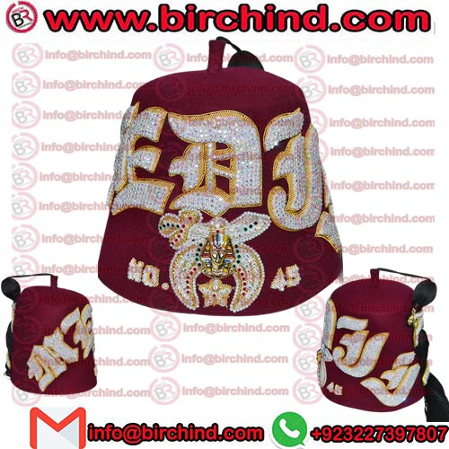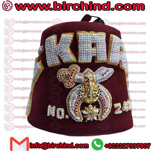 Shriners Fez Hat, Hand made jewels Embroidery High-quality embroidery underlay. The emblem in Rhinestones underlay with metal sphinx head. Shrine emblem and star outlines with beautiful pearls. Sweatband around the bottom interior of the Fez. Includes:- 18-inch black tassel .