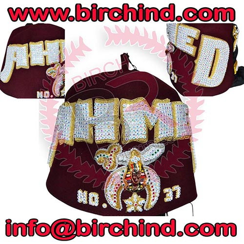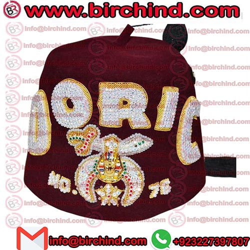 Shriners Fez Hats, Hand made Bullion with jewels Embroidery High-quality Gold and White Bullion embroidery underlay. The emblem in Rhinestones with gold Bullion underlay with metal sphinx head. Shrine emblem and star outlines with beautiful pearls. Sweatband around the bottom interior of the Fez. Includes:- 18-inch black tassel