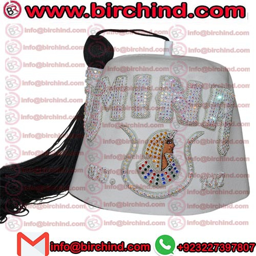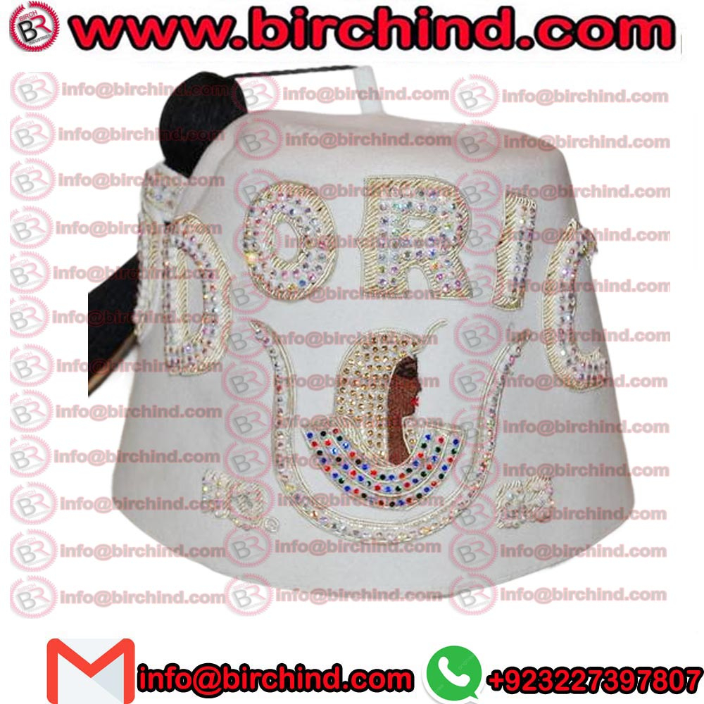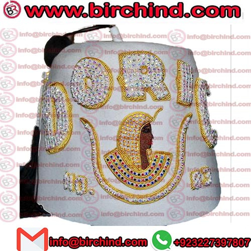 DOI Daughters of ISIS pure white Fez High-quality hand-embroidered in Rhinestones Bullion underlay. embroidered head set with colored stones with brown face. Sweatband around the bottom interior of the Fez. Includes: 18-inch black tassel