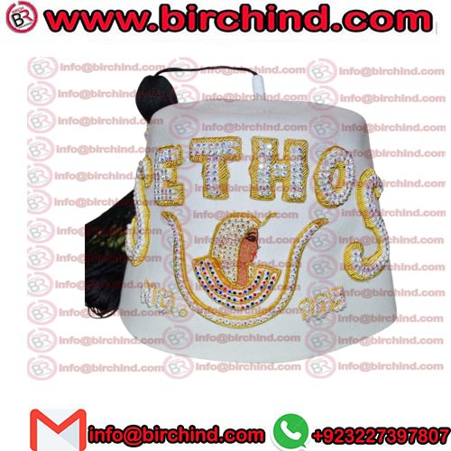 Daughters of ISIS pure white FezHigh-quality hand-embroidered in Rhinestones with Gold Bullion underlay. Gold non-tarnish embroidered head set with colored stones with brown face. Sweatband around the bottom interior of the Fez. Includes: 18-inch black tassel